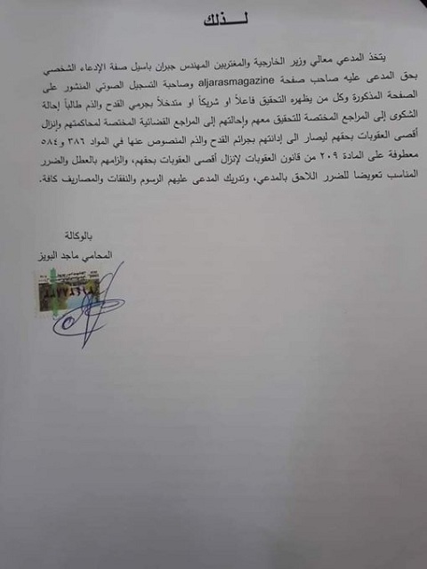 إدعى الوزير جبران باسيل ضدّ صاحبة صفحة “Al Jaras Magazine” على الانستغرام وصاحبة التسجيل الصوتي المنشور على الصفحة بجرمي القدح والذم حول شرائه عقارات في البترون، طالباً إحالة الشكوى إلى المراجع المختصّة للتحقيق معهم وإحالتهم إلى المراجع القضائية المختصّة.