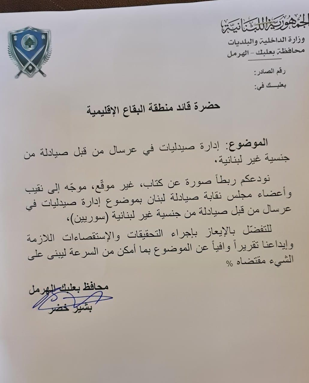 توجّه نقيب الصيادلة الدكتور جو سلوم بالشكر من سعادة محافظ بعلبك الهرمل الاستاذ بشير خضر، على أثر استجابته السريعة لمطلب نقابة الصيادلة في حماية الصيادلة اللبنانيين، من مضاربة الصيادلة الغير لبنانيين في منطقة بعلبك الهرمل.