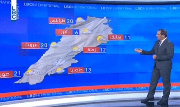 والحرارة على الساحل تتراوح من 13 الى 20 درجة، فوق الجبال من 4 الى 10 درجات، في الارز من 2 الى 7 درجات، في البقاع من 7 الى 14 درجة.