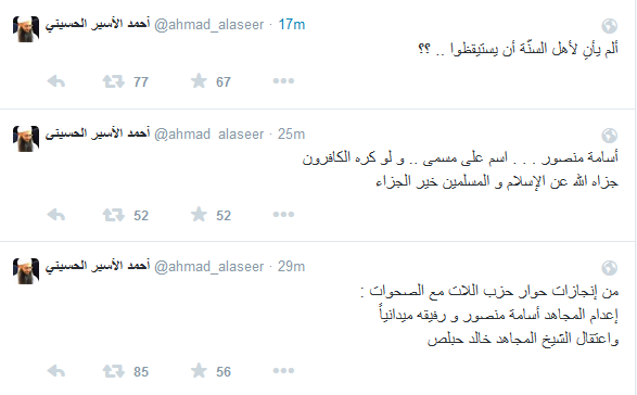 أشار الشيخ أحمد الاسير الى أنّ “من إنجازات حوار “حزب الله” إعدام المجاهد أسامة منصور ورفيقه ميدانيًا، واعتقال الشيخ المجاهد خالد حبلص”. وقال: “أسامة منصور اسم على مسمّى ولو كرهه الكافرون، جزاه الله عن الإسلام والمسلمين خير الجزاء”.