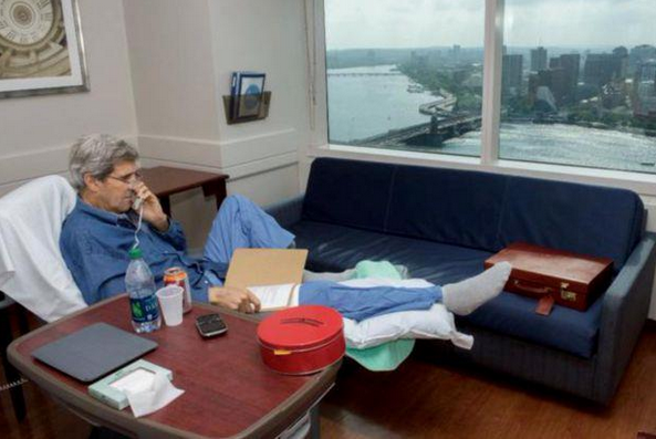 وقال الناطق باسم وزارة الخارجية الأميركية جيف راثكي، إن كيري بخير، ويمارس عمله بواسطة الهاتف من مستشفى ماساتشوستس العام”.