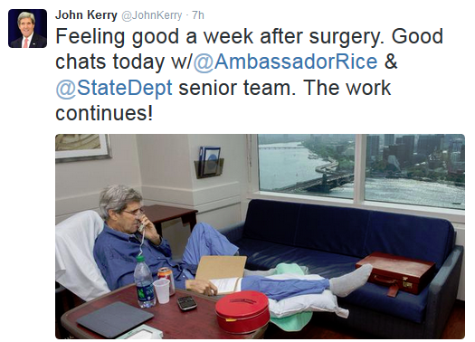 وفيما بدا أنّه استجابة لتلك الأسئلة، بثّ كيري في وقت لاحق في حسابه على موقع التواصل الاجتماعي “تويتر” صورة له في المستشفى، وهو يتحدث على الهاتف. وقال في تغريدة: “أشعر بتحسّن بعد أسبوع على الجراحة، أجريت دردشة مفيدة اليوم مع السفيرة رايس ومع فريق كبار مسؤولي وزارة الخارجية. العمل مستمر”.