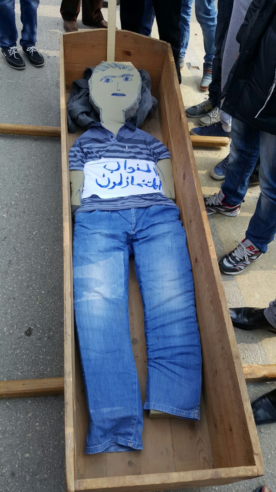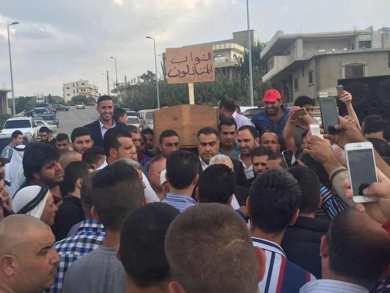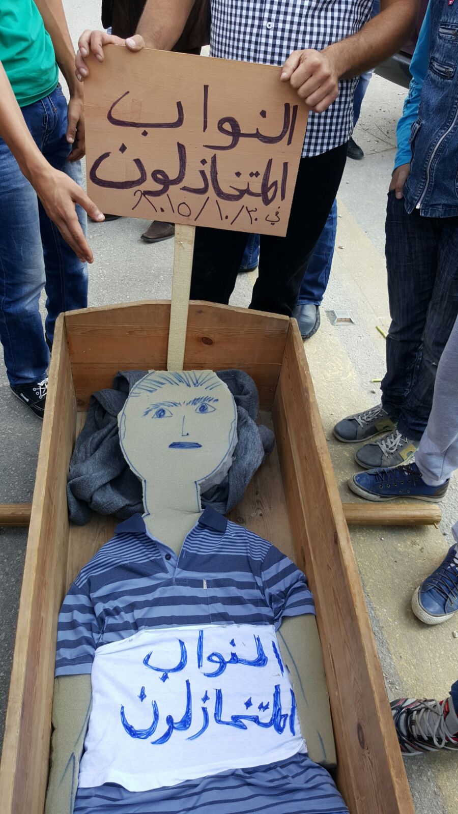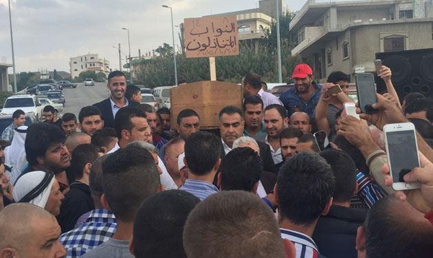 بالصور… “سرار” تجنّز النواب! October 30, 2015 01:22 PM وكالات قام أهالي القرى والبلدات المحيطة بمكب سرار وحملة “عكار لعيونك توحدنا” بجنازة رمزية للنواب الذين وافقوا على قرار انشاء مطمر في البلدة. وقد حملوا النعش وساروا به في الجنازة بعد صلاة الجمعة التي أقيمت في خيمة الاعتصام في العبودية على مفرق بلدة سرار.