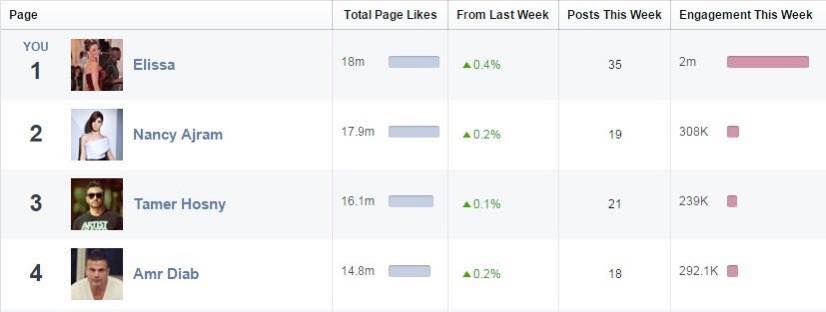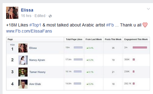 انفردت الفنانة إليسا بالصدارة لأول مرة على موقع التواصل الاجتماعي “فايس بوك”، بعدما تخطى عدد متابعين صفحتها الرسمية حاجز “18 مليون” متابع، لتتفوق على الفنانة نانسي عجرم بفارق بسيط.