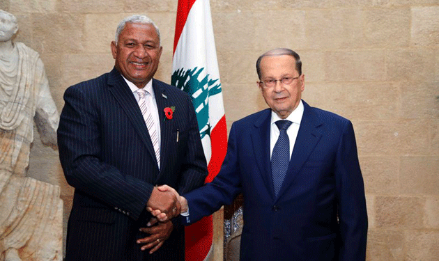 وكان عون استقبل في قصر بعبدا، رئيس وزراء فيدجي الاميرال جوسايا فوريك باينماراما على رأس وفد حكومي وعسكري من دولة فيدجي، في اطار الزيارة التي يقوم بها الى لبنان لتفقد القوة الفيدجية العاملة في الجنوب. وحضر اللقاء القنصل الفخري لدولة فيدجي في لبنان محمد شقير، والمستشار الامني والعسكري لرئيس الجمهورية العميد الركن بول مطر.