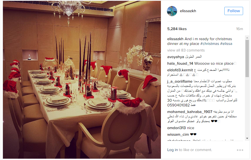 بالصورة… شاهدوا تحضيرات إليسا لعشاء الميلاد December 25, 2016 07:31 PM وكالات نشرت النجمة اللبنانية إليسا، عبر حسابها الرسمي على موقع “إنستغرام”، صورة لتحضيرات عشاء عيد الميلاد في منزلها، وعلقت عليها قائلة: “أنا مستعدة لعشاء عيد الميلاد في منزلي”.