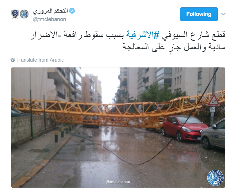 بالصورة… سقوط رافعة في الأشرفية January 27, 2017 03:46 PM وكالات ذكرت غرفة التحكم المروري، عبر حسابها على موقع “تويتر”، أنّه تم قطع شارع السيوفي في الاشرفية بسبب سقوط رافعة، موضحة أنّ الاضرار إقتصرت على الماديات والعمل جار على إزالتها.