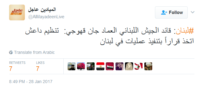 قهوجي: “داعش” إتخذ القرار بتنفيذ عمليات في لبنان! January 28, 2017 08:08 PM وكالات أعلن قائد الجيش العماد جان قهوجي، في تصريح، أنّ تنظيم “داعش” إتخذ قراراً بتنفيذ عمليات في لبنان. كلام قهوجي نقلته قناة “الميادين” الذي نشرته في تغريدة عاجلة على موقع “تويتر”.