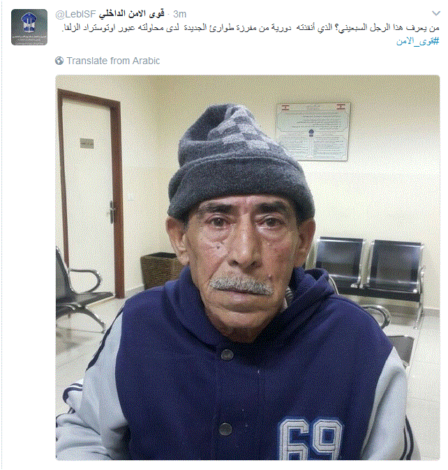 بالصورة… من يعرف هذا الرجل السبعيني؟ January 30, 2017 10:45 PM وكالات نشرت قوى الامن على حسابها الخاص عبر تويتر صورة لرجل سبعيني، وسألت “من يعرف هذا الرجل السبعيني الذي أنقذته دورية من مفرزة طوارئ الجديدة لدى محاولته عبور اوتوستراد الزلقا؟.