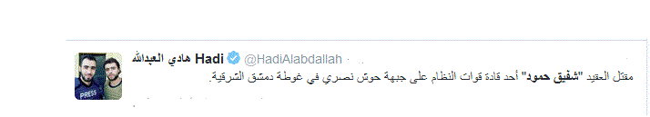 نظام الأسد يخسر أحد أكبر قادته! February 6, 2017 04:39 PM وكالات أعلن عدد من الناشطين مقتل أحد أكبر قادة قوات النظام السوري العقيد شفيق حمود. واشار الناشطون الى ان حمود هو أحد قادة الهجوم على جبهة حوش نصري في غوطة دمشق الشرقية.