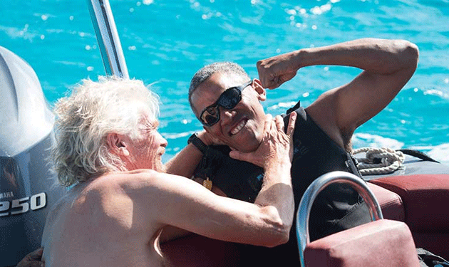وكتب برانسون “لأنه الرئيس السابق لأميركا كان هناك قدر كبير من التأمين حوله لكن باراك تمكن من الاسترخاء حقاً والاستمتاع بالتزلج الشراعي على الماء”.