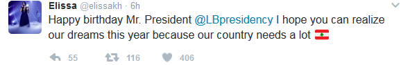 عايدت الفنانة اليسا، رئيس الجمهورية ميشال عون بمناسبة عيد ميلاده. ونشرت اليسا، عبر حسابها الخاص على “تويتر” تغريدة غريبة للرئيس عون متمنية له “تحقيق أحلامنا”، فكتبت:”عيد ميلاد سعيد السيد الرئيس.. أتمنى أن تتمكن من تحقيق أحلامنا هذا العام لان بلدنا يحتاج الكثير”.