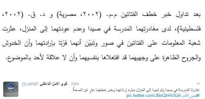 أعلنت قوى الأمن على حسابها الخاص عبر تويتر أنه “بعد تداول خبر خطف الفتاتين م.م (2002 مصرية)، و د.ق (2002 فلسطينية)، لدى مغادرتهما المدرسة في صيدا وعدم عودتهما الى المنزل، عثرت شعبة المعلومات على الفتاتين في صور وتبين انهما فرتا بإرداتهما وان الخدوش والجروح الظاهرة على وجهيهما قد افتعلاها بنفسيهما وان لا علاقة لأحد بالموضوع.