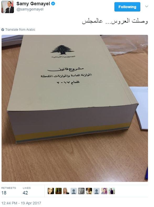 الجميّل: وصلت العروس… عالمجلس! April 19, 2017 01:03 PM وكالات نشر رئيس حزب “الكتائب” النائب سامي الجميّل عبر تويتر” صورة لـ”مشروع قانون الموازنة العامّة والموازنات الملحقة للعام 2017″، وعلّق على الصورة قائلا: “وصلت العروس… عالمجلس”.