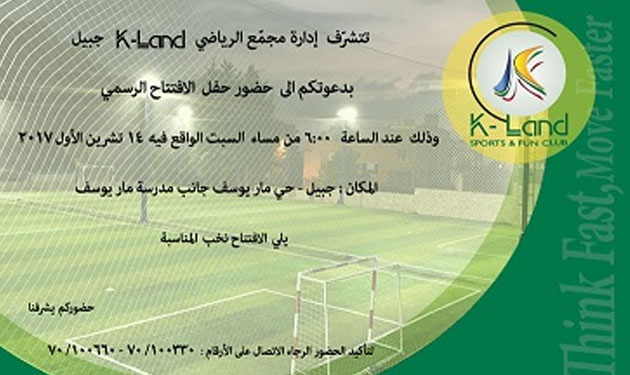 تفتتح ادارة مجمّع “كاي لاند” الرياضي في جبيل، المجمّع رسمياً عند الساعة السادسة من مساء السبت 14 تشرين الأول 2017 بحضور الفاعليات الروحية والرياضية والبلدية والتربوية.