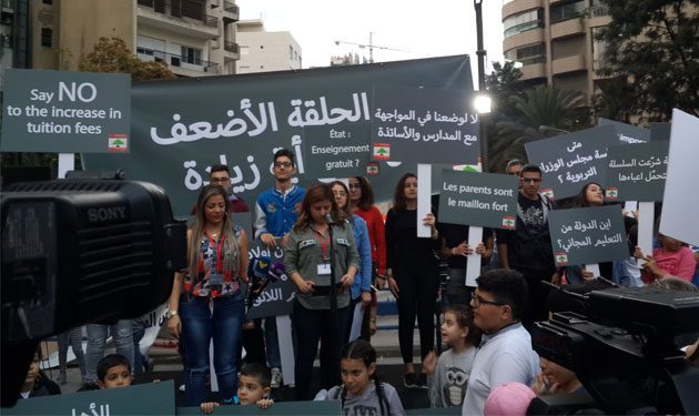 نفذت لجان الأهل في المدارس الخاصة تجمعاً احتجاجياً على زيادة الاقساط بعد اقرار سلسلة الرتب والرواتب، في ساحة ساسين في الاشرفية، شارك فيه اتحاد لجان الاهل في المدارس الكاثوليكية في بيروت، اتحاد لجان الاهل في المدارس الكاثوليكية في كسروان الفتوح وجبيل، لجان الاهل في مدارس المتن الخاصة ولجان الاهل المنبثقة عن لقاء الجمهور. وقد رفع المشاركون شعارات اكدت “رفض الزيادة وعدم قدرة الاهل على الدفع”.