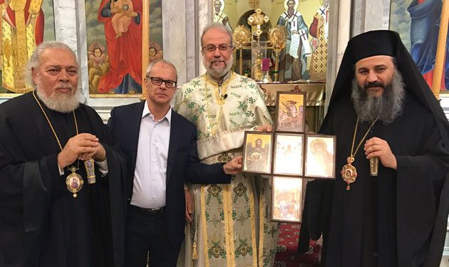 وفي ختام القداس قدم الاساقفة الصوري و صيقلي و الاب جبور ايقونات مقدسة للمهندس نكد عربون شكر و تقدير.