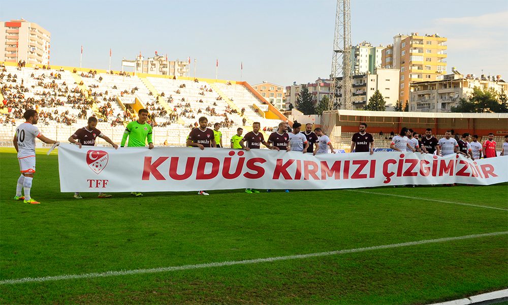دخل لاعبو كرة القدم التركية قبل انطلاق مبارياتهم يوم الجمعة 8 و السبت 9 من كانون الأول مع لافتات كتب عليها “القدس خط أحمر” تحدّياً لقرار الرئيس الأميركي دونالد ترامب الاعتراف بالقدس عاصمة لإسرائيل. وذلك على وقع هتافات الجماهير في معظم المدرجات بمختلف المدن التركية مناصرة بالقدس ومنددة بقرار ترامب. ورفعت الأعلام الفلسطينية بجانب الأعلام التركية.