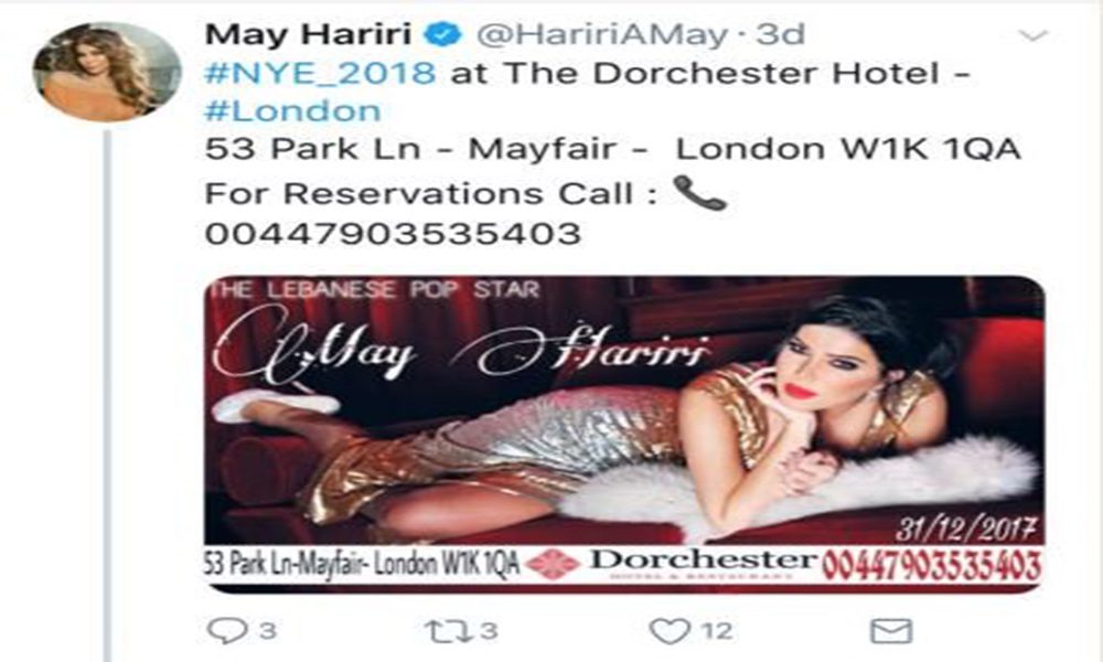 تداول ناشطون على مواقع التواصل الاجتماعي صورة لتغريدة الفنانة مي حريري عبر حسابها على “تويتر” تعلن فيها عن حفل لها في أحد فنادق لندن، وأرفقت الاعلان برقم هاتف الفندق من اجل الحجز.