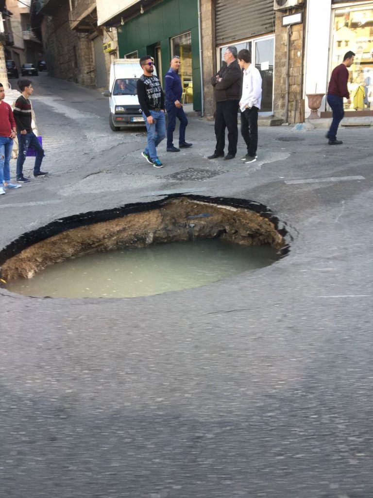 انتشر عبر مواقع التواصل الاجتماعي عدد من الصور لحفرة مياه كبيرة في زحلة يبلغ قطرها نحو المترين نتيجة انهيار الطريق.