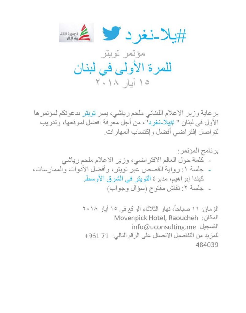 ينظم “تويتر” مؤتمره الأول في لبنان “#يلا_نغرد”، من أجل معرفة أفضل لموقعها، وتدريب لتواصل افتراضي أفضل واكتساب المهارات، برعاية وزير الإعلام ملحم الرياشي.