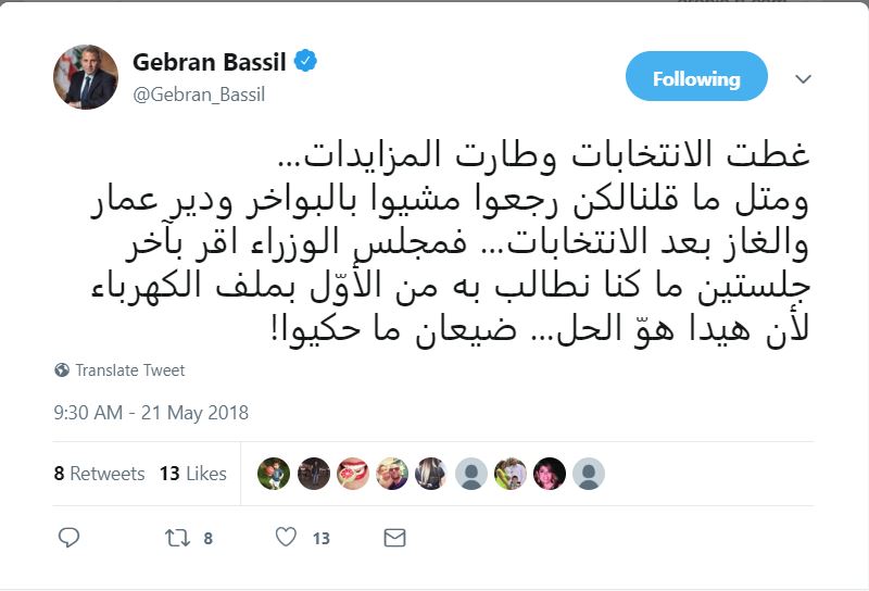 علق وزير الخارجية والمغتربين جبران باسيل على القرارات التي اتخذها مجاس الوزراء بما يخص الكهرباء، قائلا على حسابه عبر “تويتر”: “غطت الانتخابات وطارت المزايدات…  ومتل ما قلنالكن رجعوا مشيوا بالبواخر ودير عمار والغاز بعد الانتخابات… فمجلس الوزراء اقر بآخر جلستين ما كنا نطالب به من الأوّل بملف الكهرباء لأن هيدا هوّ الحل… ضيعان ما حكيوا!”.