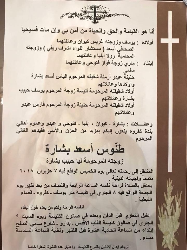توفي السيد طنوس أسعد بشارة والد مستشار اللواء اشرف ريفي الصحافي الزميل أسعد بشارة.