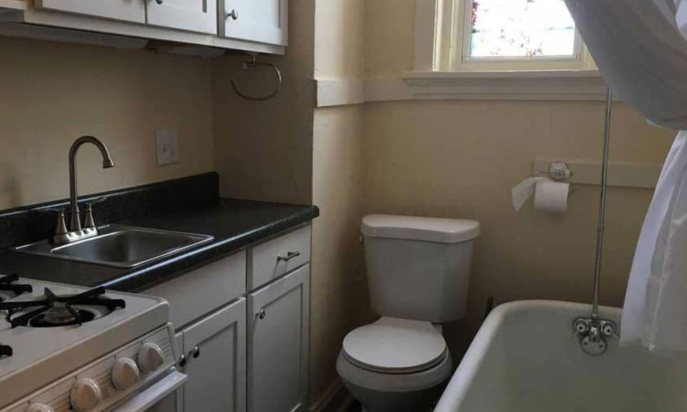 فالمرحاض وحوض الاستحمام والفرن وغسالة الملابس في غرفة واحدة داخل الشقة التي تبلغ مساحتها 18.5 متر مربع، وتقع في حي سنترال ويست إند بمدينة سانت لويس الكائنة في ولاية ميزوري.