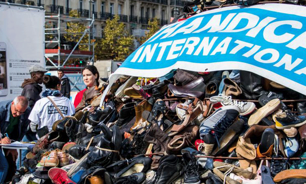 دعت منظمة “هانديكاب إنترنشونال” سكان العاصمة الفرنسية باريس إلى رمي أحذيتهم المستعملة في وسط العاصمة الفرنسية احتجاجا على قصف المدنيين في مناطق الحروب في العالم.