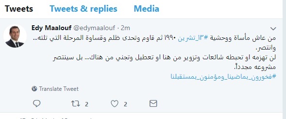 معلوف: من عاش ذكرى 13 تشرين وانتصر لن يُهزَم October 12, 2018 08:57 AM وكالات في ذكرى 13 تشرين، غرد النائب ايدي معلوف على حسابه على “تويتر” بالقول: “من عاش مأساة ووحشية 13 تشرين 1990 ثم قاوم وتحدى ظلم وقساوة المرحلة التي تلته… وانتصر، لن تهزمه او تحبطه شائعات وتزوير من هنا او تعطيل وتجني من هناك… بل سينتصر مشروعه مجدداً.”
