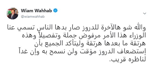 قال رئيس حزب “التوحيد العربي” وئام وهاب: “والله شو هالآخرة للدروز صار بدها الناس تسمّي عنا الوزراء”، مؤكدًا أن “هذا الأمر مرفوض جملة وتفصيلًا”.