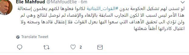 غرد رئيس حركة “التغيير” المحامي ايلي محفوض عبر حسابه على “تويتر” بالقول: “لو تسنى لهم تشكيل الحكومة بدون القوات اللبنانية لكانوا فعلوها لكنهم يعلمون إستحالة هذا الأمر ليس لسبب الا لكون التجارب السابقة بالإلغاء والإقصاء لم توصل لنتائج وهي لم ولن تؤدي الى تحقيق الأهداف التي سعوا اليها بعزل القوات فلا إعتقال قائدها وسجنه ولا اغتيال كادراتها أطفأ شعلتها”.