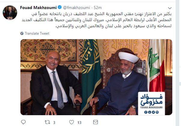 غرد النائب فؤاد مخزومي عبر حسابه على “تويتر” بالقول: “بكثير من الاعتزاز نهنئ مفتي الجمهورية الشيخ عبد اللطيف دريان بانتخابه عضوا في المجلس الأعلى لرابطة العالم الإسلامي. مبروك للبنان وللبنانيين جميعا هذا التكليف الجديد لسماحته والذي سيعود بالخير على لبنان والعالمين العربي والإسلامي”.
