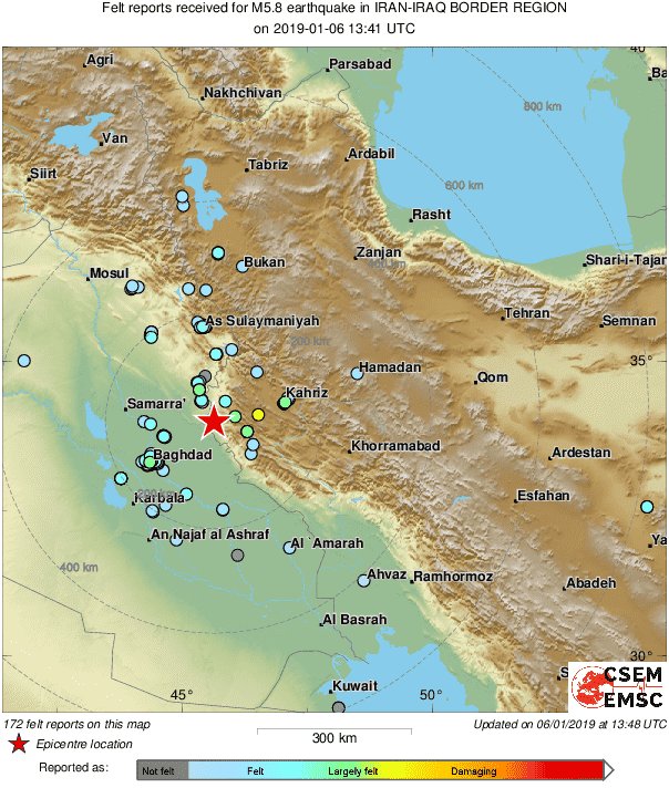 ضرب زلزال بقوة 5,9 على مقياس ريختر، وبعمق 10 كيلومتر، مناطق محافظة كيلان غرب، عند الساعة الخامسة و11 دقيقة عصر الاحد، وحتى الآن لم يبلغ عن وقوع خسائر.