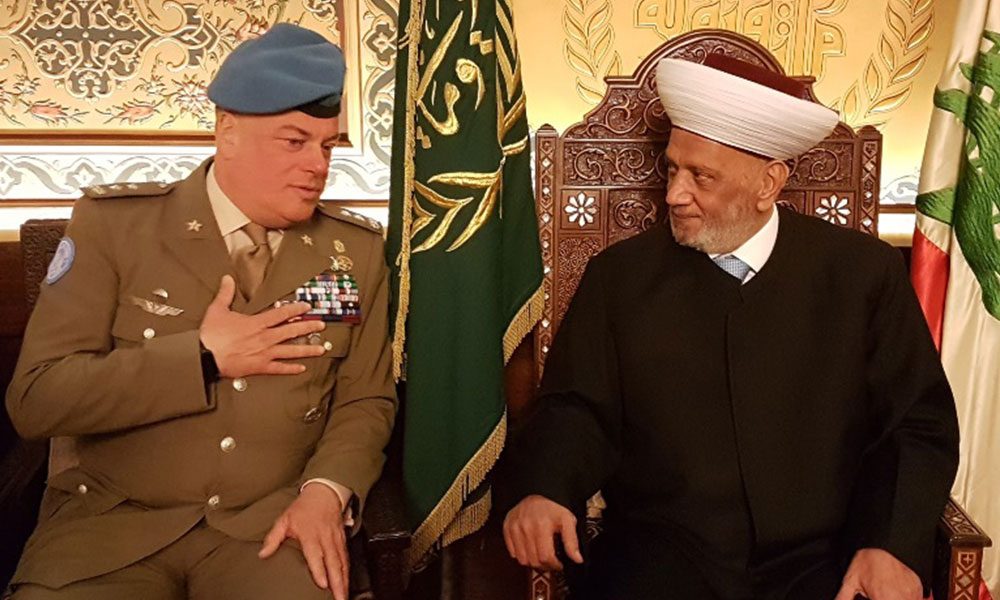 بحث مفتي الجمهورية الشيخ عبد اللطيف دريان مع القائد العام لقوات الطوارئ الدولية في لبنان اللواء ستيفانو ديل كول (اليونيفيل) في الشؤون اللبنانية وخصوصا في المهام التي تقوم بها قوات الطوارئ في الجنوب اللبناني.