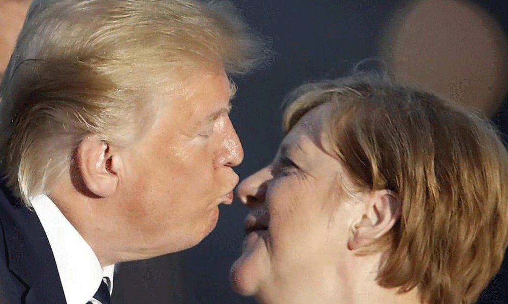 على الأقل هذا ما كان مفترضا، لكن “استعدادات” ترامب للقبلة يبدو أنها كانت تشير إلى قبلة من نوع آخر، فشكل القبلة كان يوحي بأنها تتجه إلى مكان غير خد ميركل، وبالتأكيد ليس فمها.