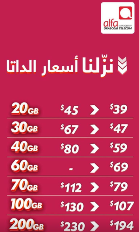 “ألفا” تخفّض اسعار اشتراكات خدمة الانترنت September 20, 2019 11:29 AM وكالات خفضت شركة “الفا” اسعار اشتراكات خدمة الانترنت لزبائنها. وقد جاءت الاسعار على الشكل التالي: