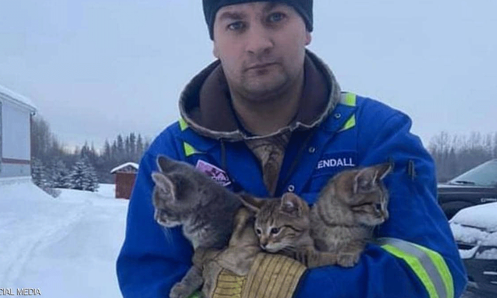 عثر كندي يعمل في مجال النفط على 3 قطط صغيرة وسط طريق تغطيه الثلوج، وكان يبدو أنها غير قادرة على الابتعاد من أمام السيارة.