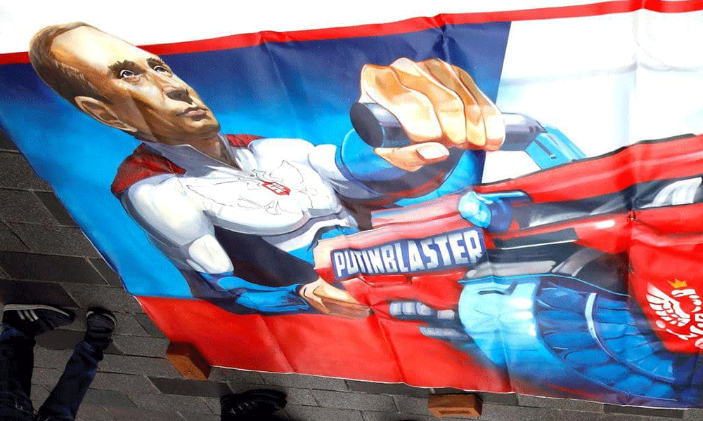 وتابع: “أردت أن ألفت الانتباه للكيفية التي نرى بها بوتن في روسيا مثل بطل خارق. لذلك كتبت على اللوحات بوتن بطل خارق”.