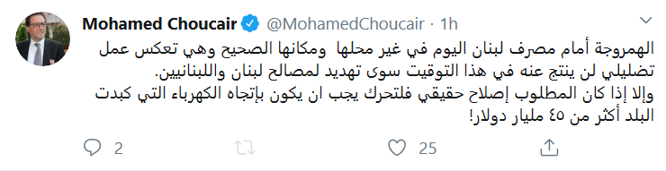 غرد رئيس الهيئات الاقتصادية محمد شقير، عبر “تويتر”، قائلًا: “الهمروجة أمام مصرف لبنان اليوم في غير محلها و في غير مكانها الصحيح، وهي تعكس عملًا تضليليًا لن ينتج عنه في هذا التوقيت سوى تهديد لمصالح لبنان واللبنانيين. وإذا كان المطلوب إصلاحًا حقيقيًا، فالتحرك يجب أن يكون باتجاه الكهرباء التي كبدت البلد أكثر من 45 مليار دولار!”.