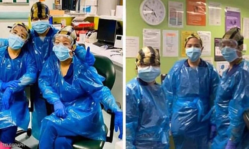 التقطت صورة في أذار الماضي لثلاث ممرضات في أحد مستشفيات بريطانيا وهن يرتدين أكياس قمامة، ويغطين رؤوسهن وأقدامهن بقطع من أكياس بلاستيكية، بسبب نقص معدات الحماية الشخصية.