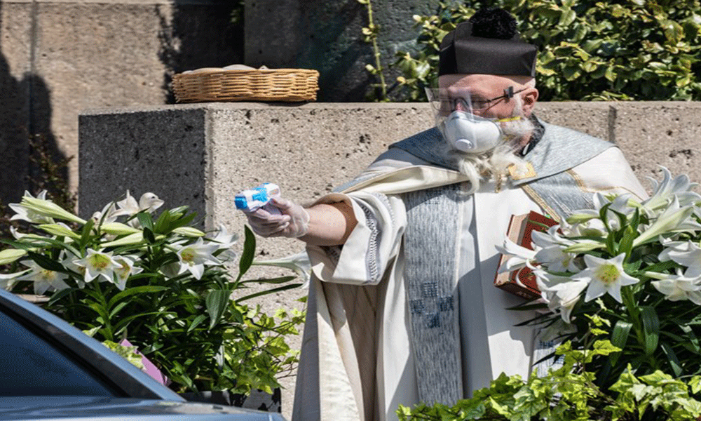 وتناقلت مواقع التواصل الاجتماعي صور كنيسة سانت أمبروز، يظهر فيها الكاهن تيموثي بيلك وهو يرتدي الكمامة والقفازات المطاطية ويرش المياه المقدسة داخل السيارات، خلال توقفها على مسافة أمتار من الكنيسة.