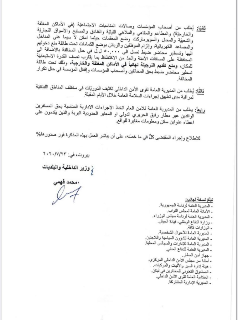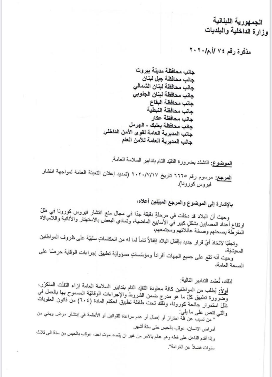 بعد ارتفاع عدد إصابات كورونا.. “الداخلية”: تقيّدوا بهذه التدابير! July 23, 2020 10:44 AM وكالات أصدرت وزارة الداخلية والبلديات مذكرة شددت فيها على ضرورة التقيد التام بتدابير السلامة العامة، لمواجهة انتشار فيروس كورونا. وجاء فيها: