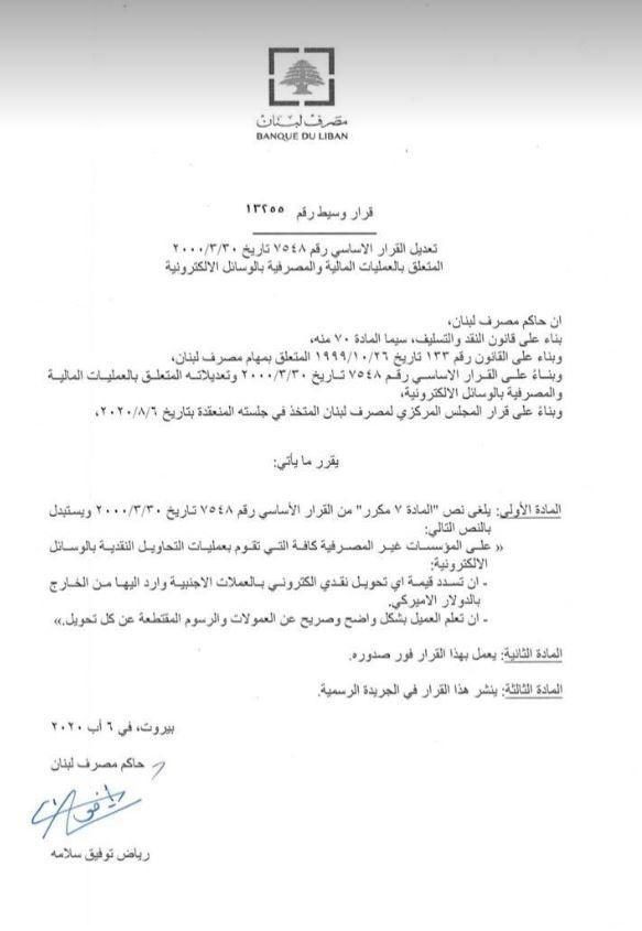 صدر عن مصرف لبنان تعميم يطلب فيه من مؤسسات التحويل المالي الإلكتروني تسليم الحوالات الإلكترونية من الخارج بالدولار الأميركي، وليس بالليرة اللبنانية كما يتم تسليمها حالياً وفق سعر صرف 3900 ليرة.
