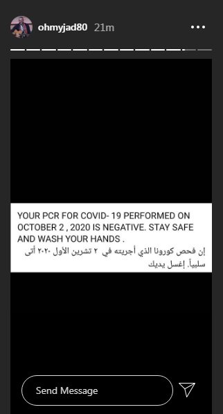 جاد بو كرم يعلن تعافيه من كورونا! October 3, 2020 12:10 PM وكالات أعلن الكوميدي جاد بو كرم عن تعافيه من فيروس كورونا، بعدما اُصيب وزوجته قبل حوالي أسبوعين بالفيروس. وفي التفاصيل، كشف جاد لمتابعيه عبر الـ”ستوري” على تطبيق إنستغرام أنه تعافى من كورونا، وذلك بنشر الرسالة التي وردته لإعلان النتيجة، وجاء فيها: