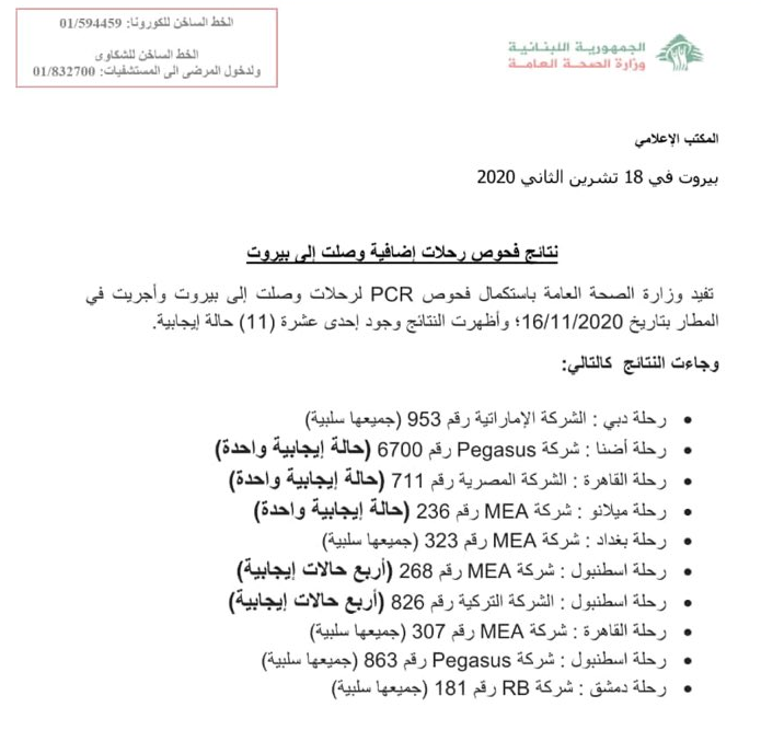 11 مصابًا بـ”كورونا” على متن رحلات وصلت إلى بيروت November 18, 2020 09:14 PM وكالات أفادت وزارة الصحة العامة باستكمال فحوص PCR لرحلات وصلت إلى بيروت وأجريت في المطار في تاريخ 16/11/2020؛ وأظهرت النتائج وجود 11 حالة إيجابية.