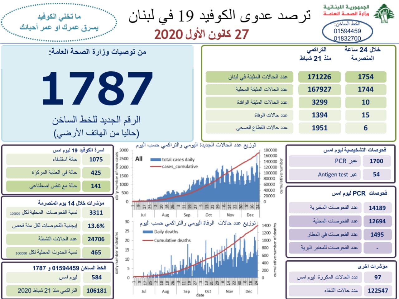 لبنان يسجّل 1754 إصابة جديدة بـ”كورونا” و15 وفاة December 27, 2020 06:29 PM وكالات أعلنت وزارة الصحة العامة تسجيل 1754 إصابة جديدة بفيروس “كورونا” في لبنان، ما يرفع العدد الإجمالي للإصابات إلى 171226. كما أفادت عن تسجيل 15 حالة وفاة جديدة ترفع الحصيلة الإجمالية للوفيات إلى 1394.