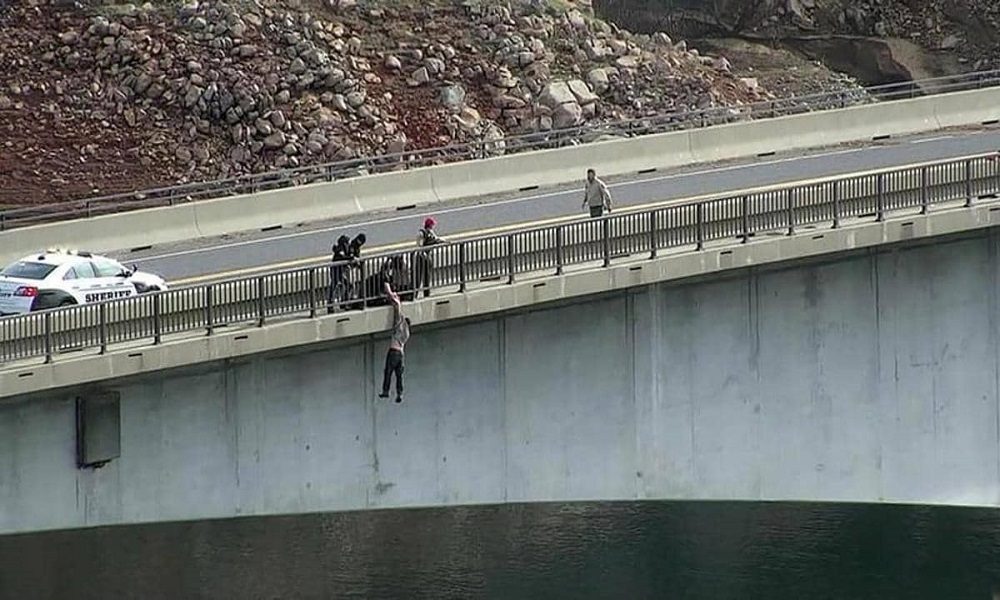 أنقذ شرطي، رجلا كان يقفز من فوق جسر ارتفاعه قرابة 46 مترا، عندما أمسك بذراعة من خلف قضبان الحاجز الجانبي.