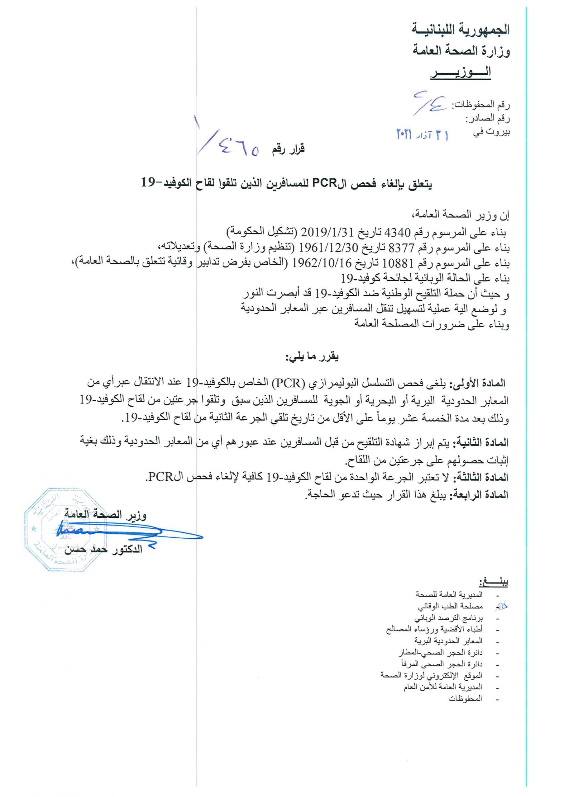 إلغاء فحص الـ”PCR” للمسافرين الذين تلقوا لقاح كورونا March 31, 2021 04:07 PM وكالات أصدر وزير الصحة في حكومة تصريف الأعمال حمد حسن قرارًا يتعلّق بإلغاء فحص الـPCR للمسافرين الذين تلقوا لقاح الكوفيد 19.