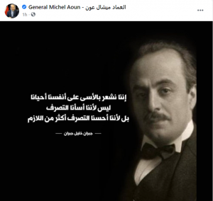 وعبر صفحاته الرسمية على مواقع التواصل، نشر عون المقولة التي تقول: “إننا نشعر بالأسى على أنفسنا أحياناً ليس لأننا أسأنا التصرف بل لأننا أحسنا التصرف اكثر من اللازم”.